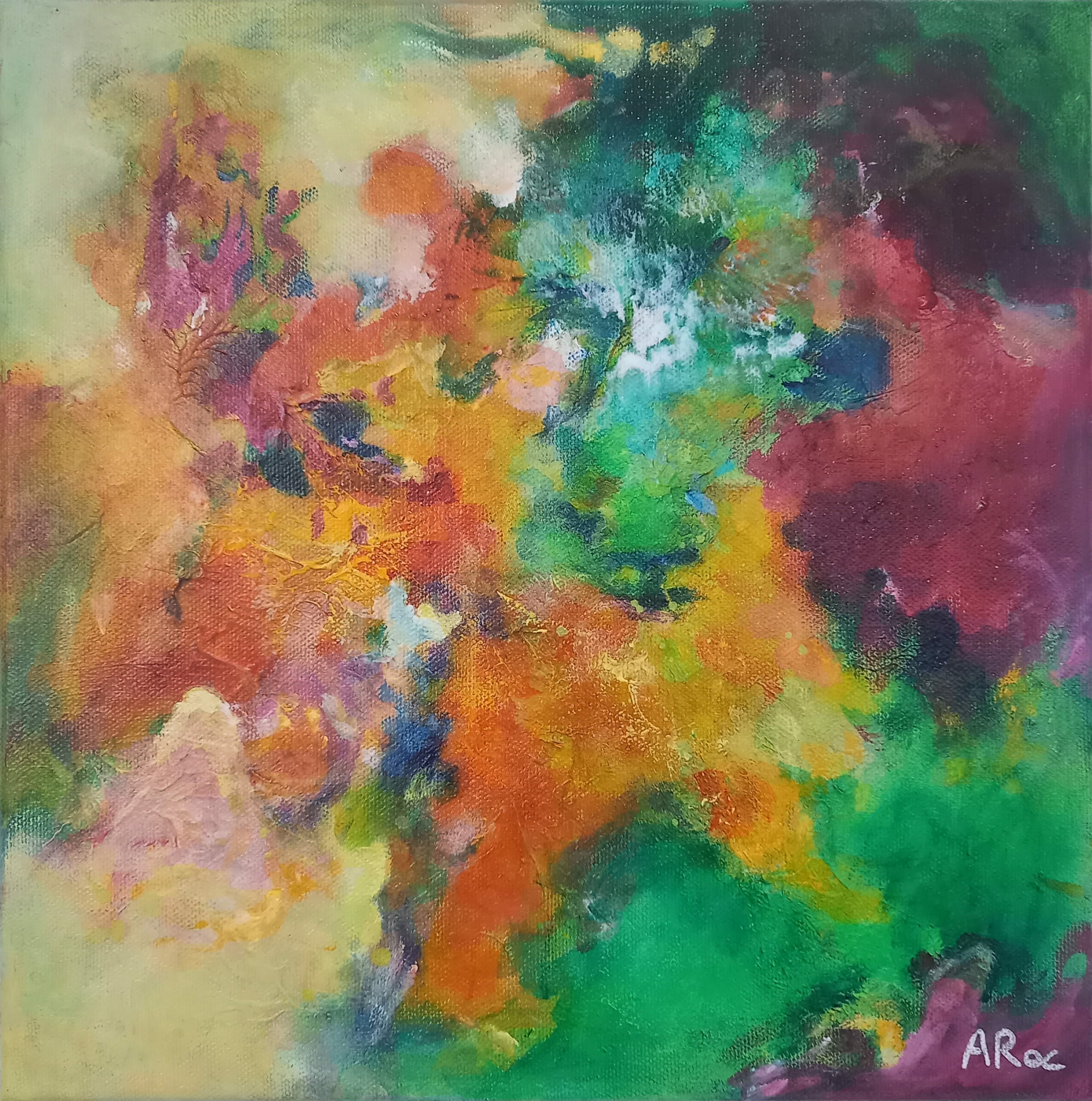 Cette peinture abstraite transmet une sensation plutôt qu’un récit : une expérience émotionnelle et sensorielle, à la fois chaleureuse et mystérieuse.