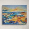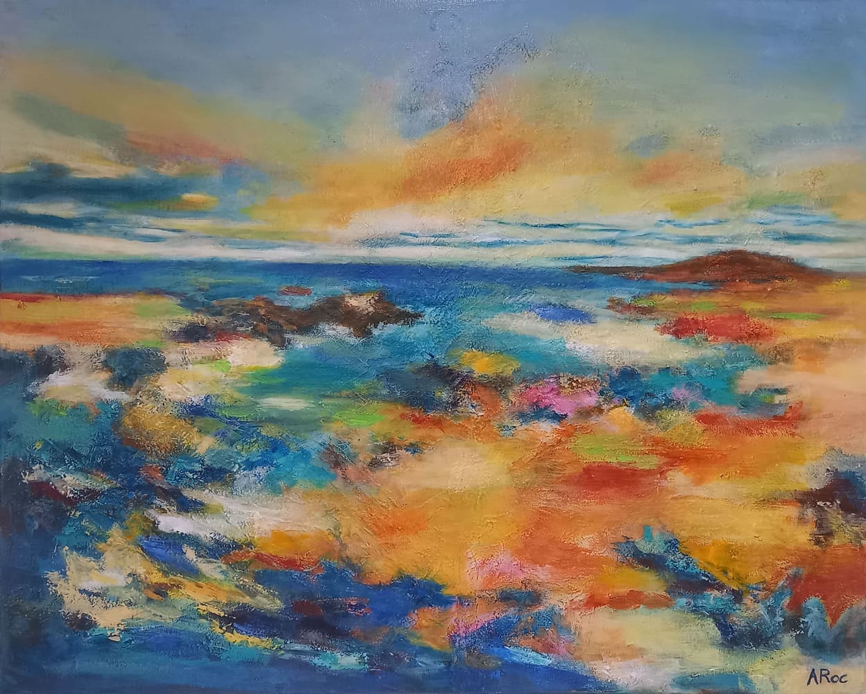 Dans cette œuvre, j’ai cherché à saisir l’émotion vaste et silencieuse qui émane du dialogue entre le ciel et la mer. Les teintes vibrantes se fondent dans la douceur des horizons, mêlant l’élan de la lumière à la tranquillité des eaux. La peinture acrylique, alliée à la poudre de marbre, offre une texture profonde où la matière semble respirer, invitant le regard à se laisser porter.